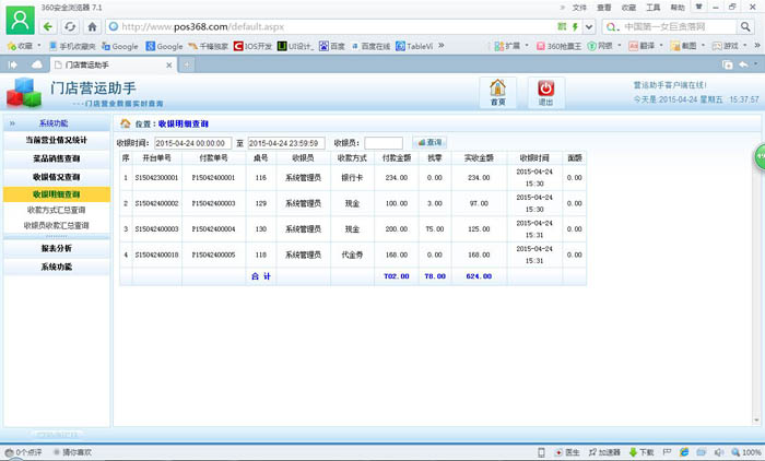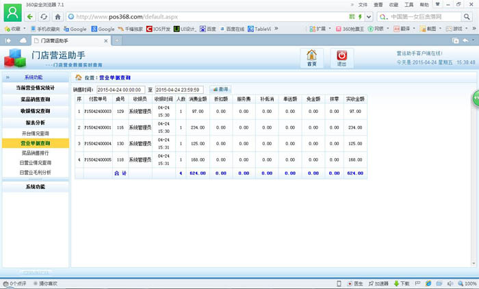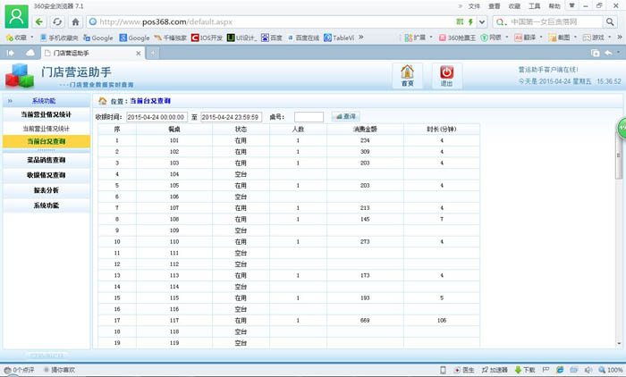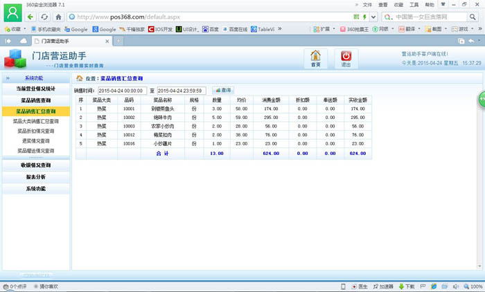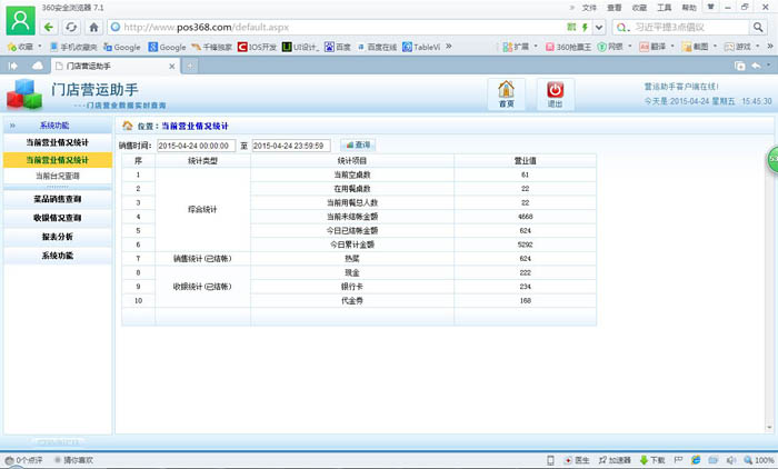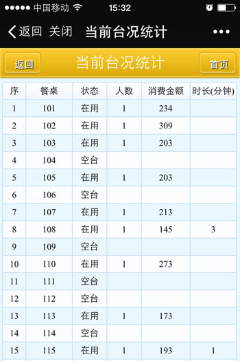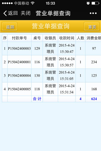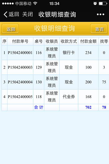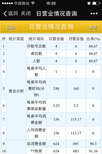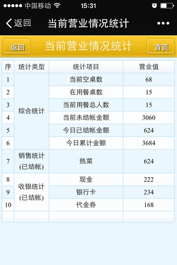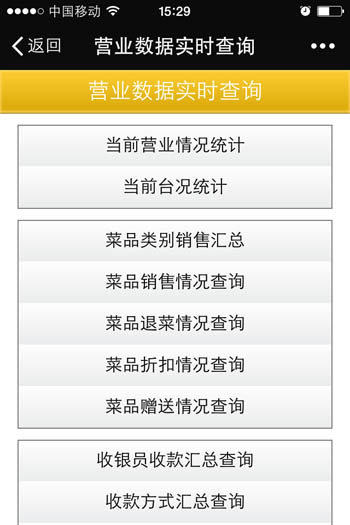 | 當前營業情況:當前營業情況統計、當前臺況統計 銷售報表:菜品類別銷售匯總、菜品銷售情況、退菜查詢、折扣查詢、贈送查詢 收銀報表:收銀員收款匯總查詢、收款方式匯總、收銀明細 報表分析:日營業情況統計、日營業毛利分析、菜品銷售排行榜、營業單據查詢、開臺情況查詢 |